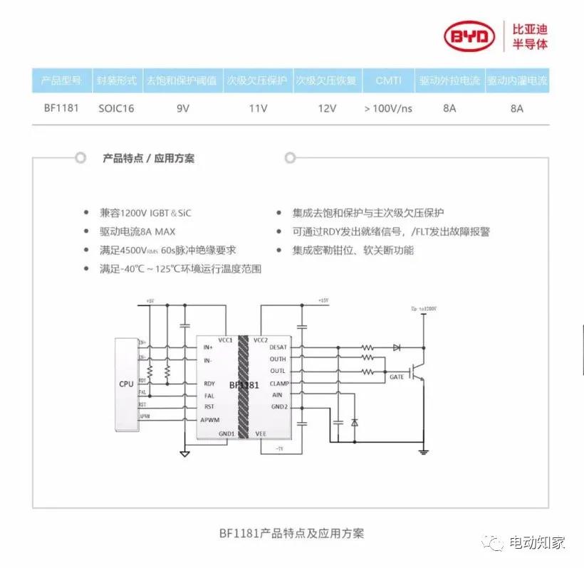 來自電動知家消息,12月14日,比亞迪半導(dǎo)體在先前研發(fā)成果的基礎(chǔ)上,成功自主研制并量產(chǎn)1200V功率器件驅(qū)動芯片BF1181,今年12月大規(guī)模生產(chǎn)并向各大廠商供貨。